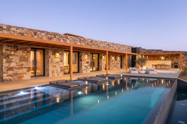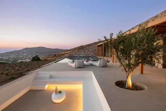 • Luxury modern house with white exterior, outdoor pool, tropical trees and plants, illuminated outdoor seating area, and an open indoor bar and kitchen visible through large glass windows.